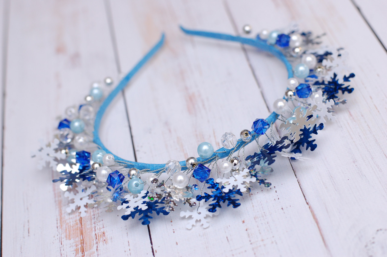 Показати оптові ціниНоворічний обідок виготовлений у біло-синьому кольорі. Декорований намистинами різних форм квітів і сніжинками. В основі виробу металевий обруч 0.5 см. У роботі використаний мідний дріт 0.3 см, до якого кріпляться намистини та сніжинки. Кожна намистина та сніжинка прикріплена вручну!