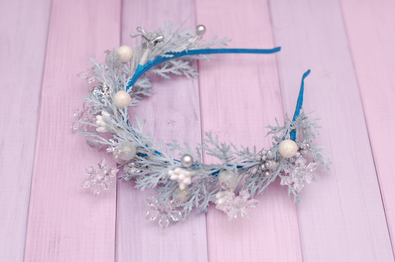 Обідок виконаний на металевій основі у біло-блакитно-сріблястих кольорах. Декорований гілочками, ягідками, тичинками та сніжинками. Підійде для красивих зимових фотосесій, на ранки