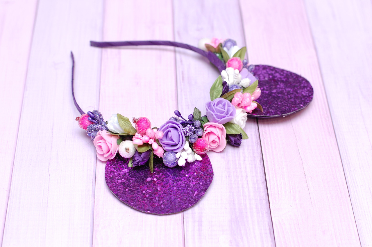 Ободок Мінні Маус виконаний в біло-рожево-фіолетовому кольорі, декорований вушками з екошкіри.