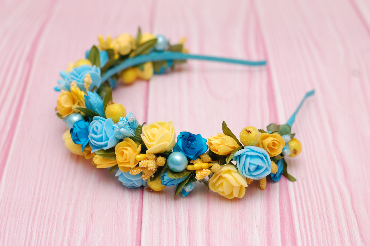 Обруч для волосся виконаний у жовто-блакитних кольорах. В роботі використані квіти із фоамірану, бумажняні, ягодки та тичинки.