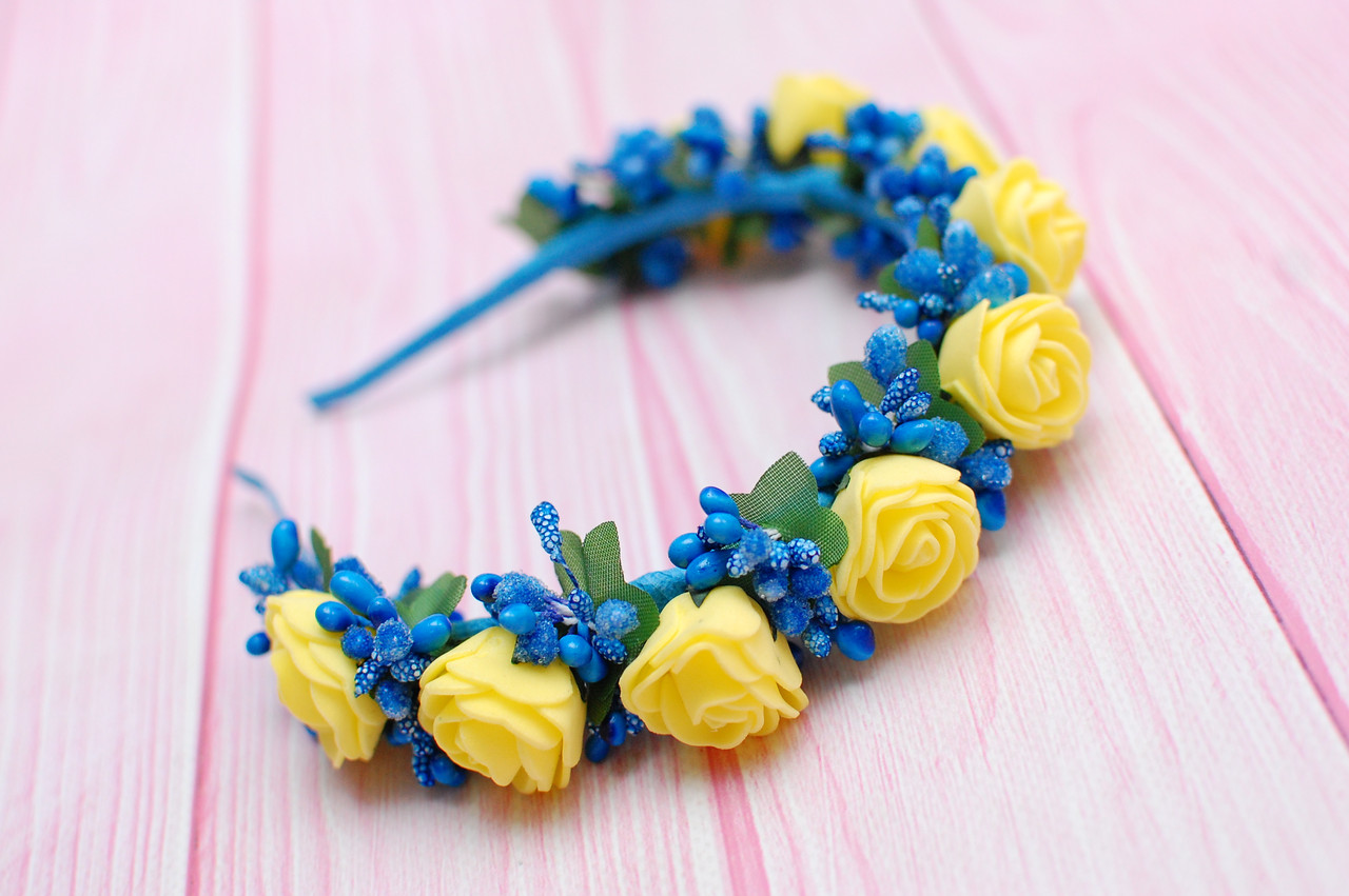 Нарядний обруч із штучних квітів виконаний в поєднанні жовтого і синього кольорів. Ідеально буде пасувати до вишиванки. Можна вдягнути на весілля, національне свято
